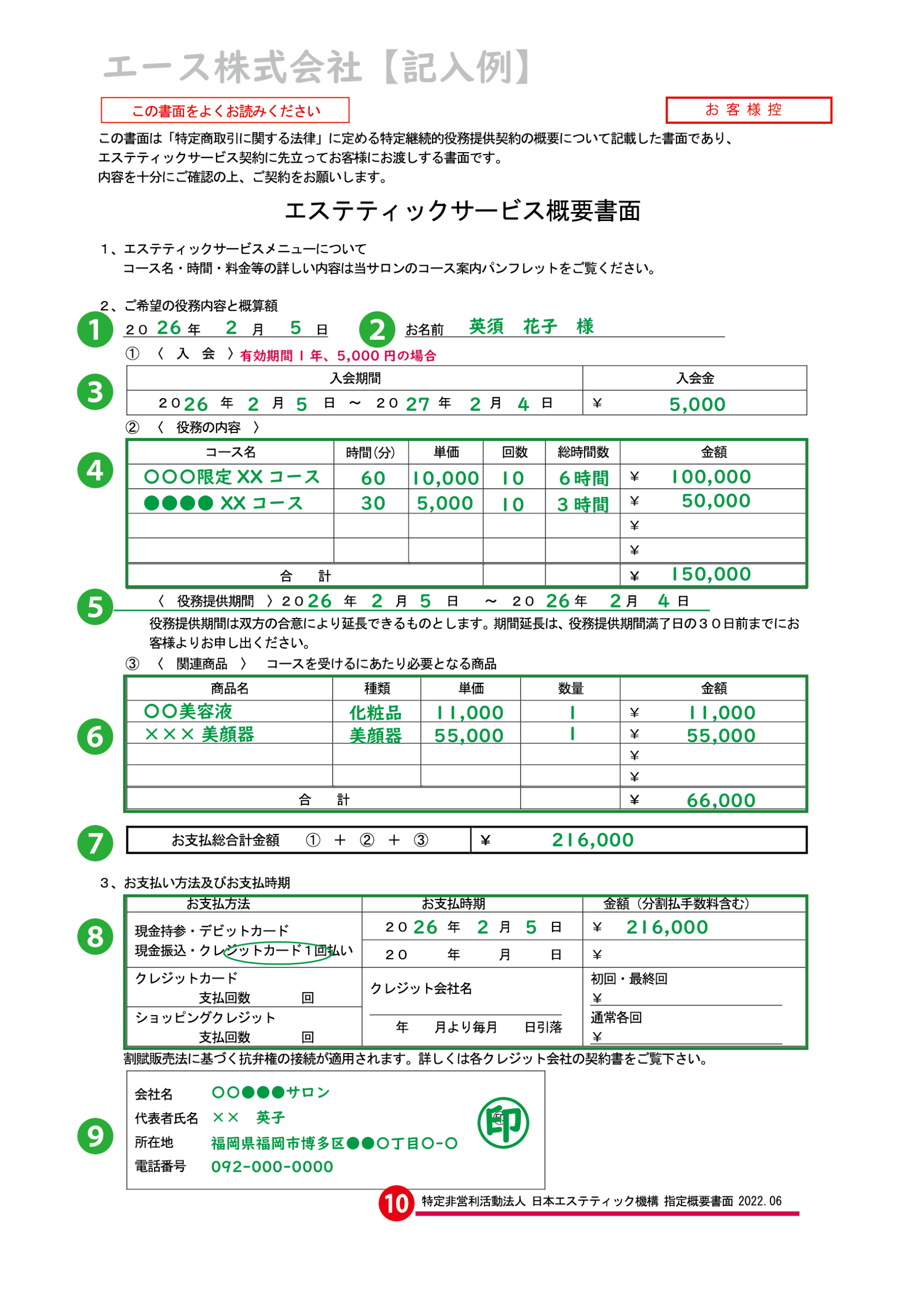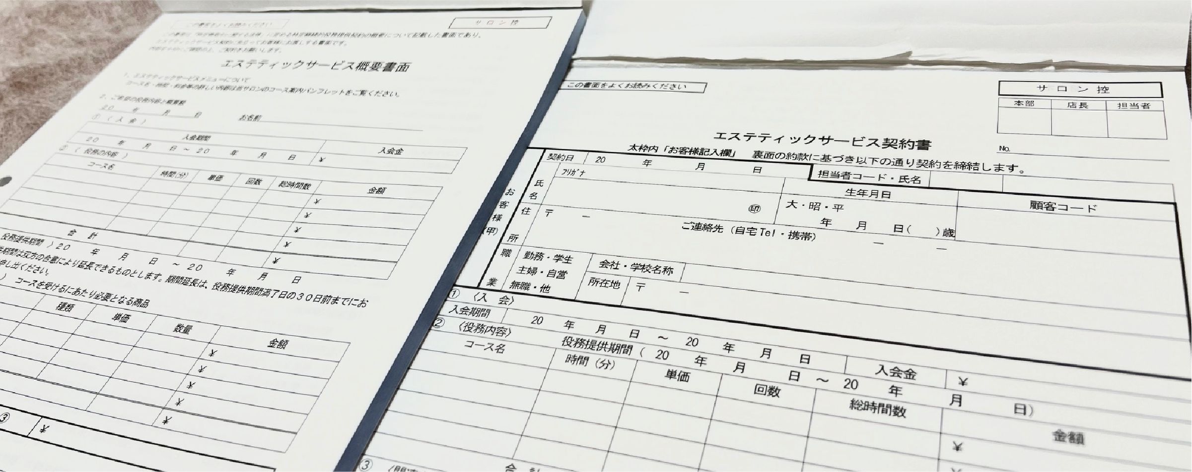 エステサロンの現場では、どうしても「契約書」に意識が向きがちですが、その前にある「概要書面」は、説明を進めるうえで欠かせない書類です。